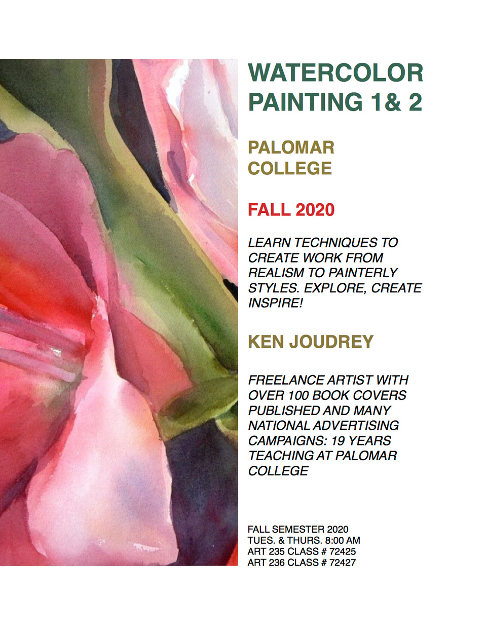 Ken Joudrey, a freelance artist with 19 years experiencing teaching at Palomar College, will be offering Watercolor Painting 1 & 2 (Art 235 class # 72425 and Art 236 # 72427) in the Fall of 2020. Registration will begin June 4th.