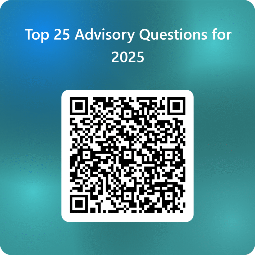 Please take a few minutes to respond to the questions above by scanning the QR code below or clicking this link Top 25 Advisory Questions for 2025 – Fill out form