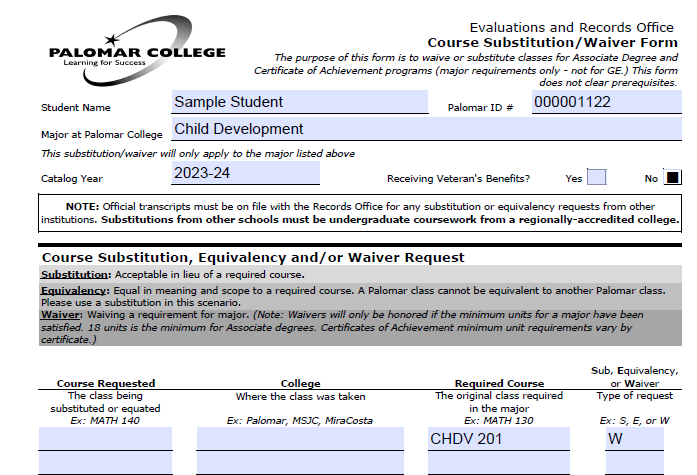 The form below is an example of a waiver for a Child Development degree. If the waiver should be limited to a specific degree, such as Child Development Teacher, the major should be listed as Child Development Teacher. If the waiver should apply to any Child Development degree that has CHDV 201 as a major requirement, the major should be listed as Child Development and the waiver will apply to any degree under the Child Development umbrella.