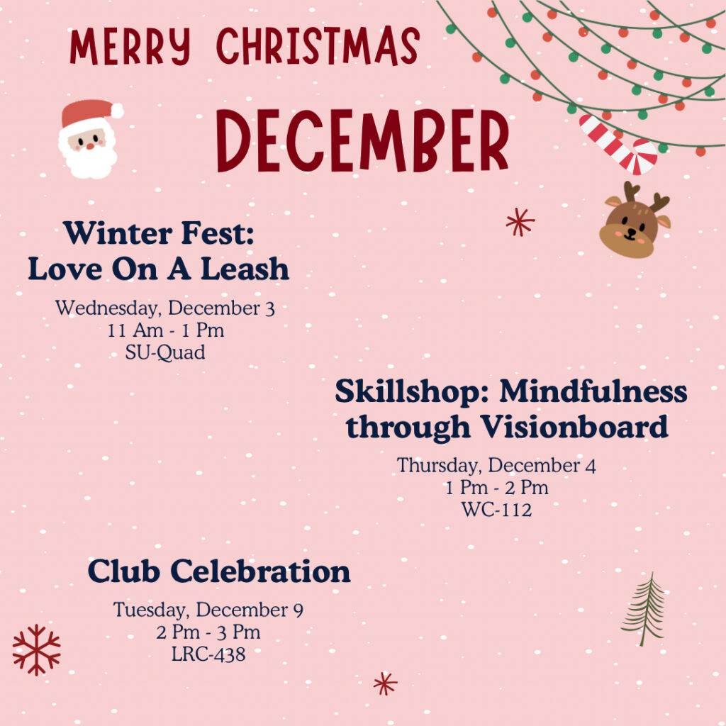 Club Winter Fest Event – Wednesday, December 3rd 10am-1pm, SU-Quad featuring Love on a Leash Pet Therapy and Winter Crafts