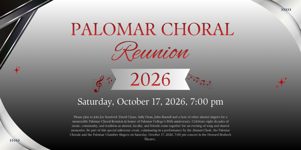 Please plan to join Joe Stanford, David Chase, Sally Dean, John Russell and a host of other alumni singers for a memorable Palomar Choral Reunion in honor of Palomar College’s 80th anniversary. Celebrate eight decades of music, community, and tradition as alumni, faculty, and friends come together for an evening of song and shared memories. Be part of this special milestone event, culminating in a performance by the Alumni Choir, the Palomar Chorale and the Palomar Chamber Singers on Saturday, October 17, 2026, 7:00pm concert in the Howard Brubeck Theatre.