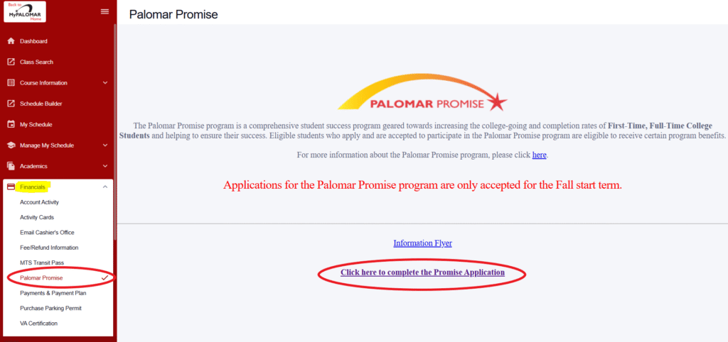 Eligible students must first apply to Palomar College by completing the Palomar College admissions application via CCCApply. Students must complete the Palomar Promise application located on their MyPalomar student portal. Once you have logged into MyPalomar, click on the Financials tab (see image below). If you are unable to view the Promise application link, please contact our office via email at promise@palomar.edu or call us at 760-744-1150, ext. 3931. Applications will be considered on a first-come, first-served basis dependent upon availability of funds