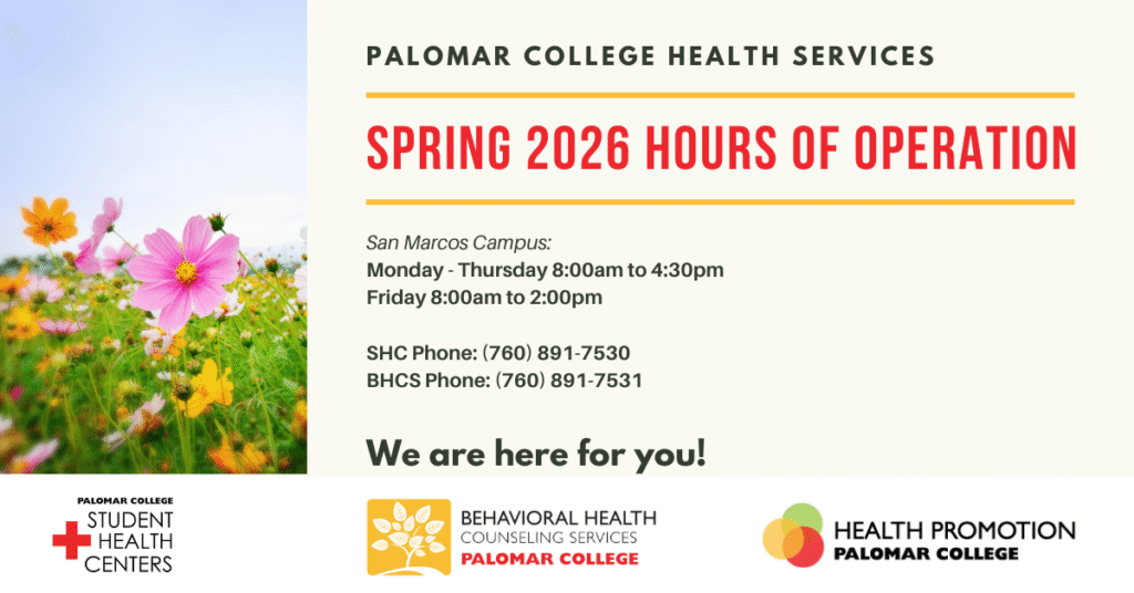 We provide a range of basic medical services for Palomar College students. Over-the-Counter medication and supplies are also available for pick up.
