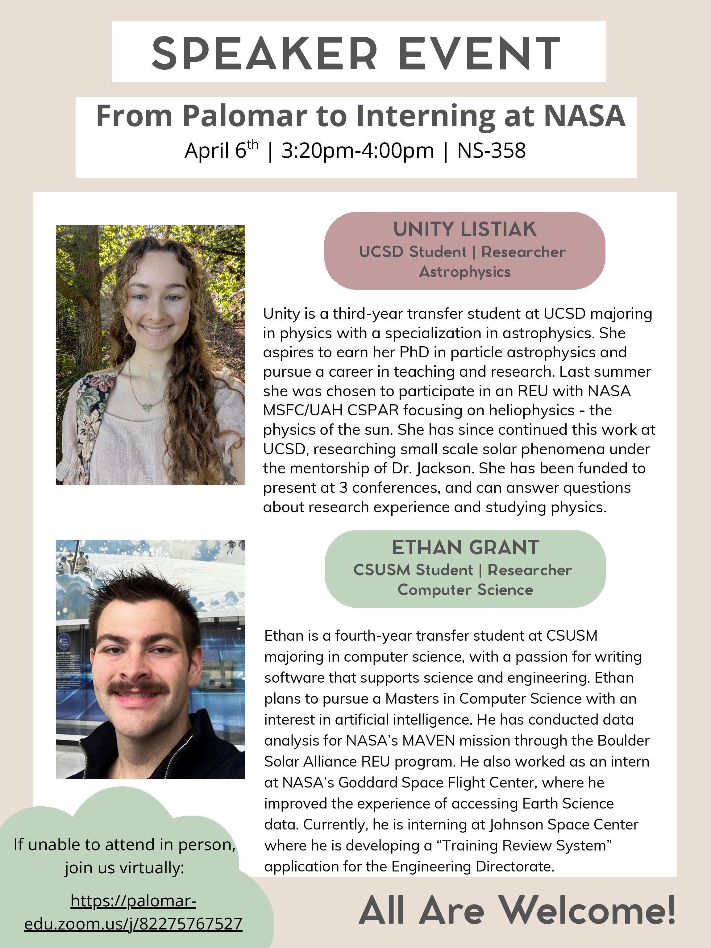 Ever wondered what it'd be like to intern at NASA? Join us on Monday, April 6th from 3:20pm-4pm to hear from two former Palomar students, Unity Listiak and Ethan Grant, who transferred to UCSD and CSUSM. Hear about what the transfer process was like for them, ask questions about their majors, and find out what… Continue Reading Speaker Event: From Palomar to Interning at NASA