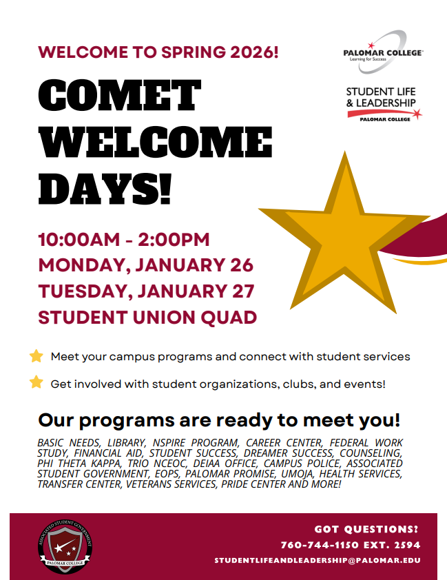 Student Life & Leadership and the Associated Student Government invite all students, faculty, and staff to join us for Comet Welcome Days, a two-day welcome celebration for new and returning Palomar College students!